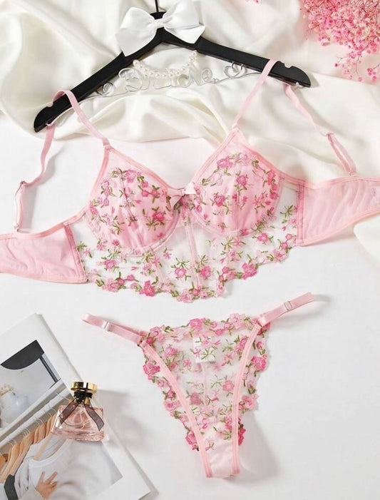 Flourish Sexy Premium Non-Padded Wired Floral Embroidered Bra & Thong Set – Luxury Pink Mesh Lingerie 50121