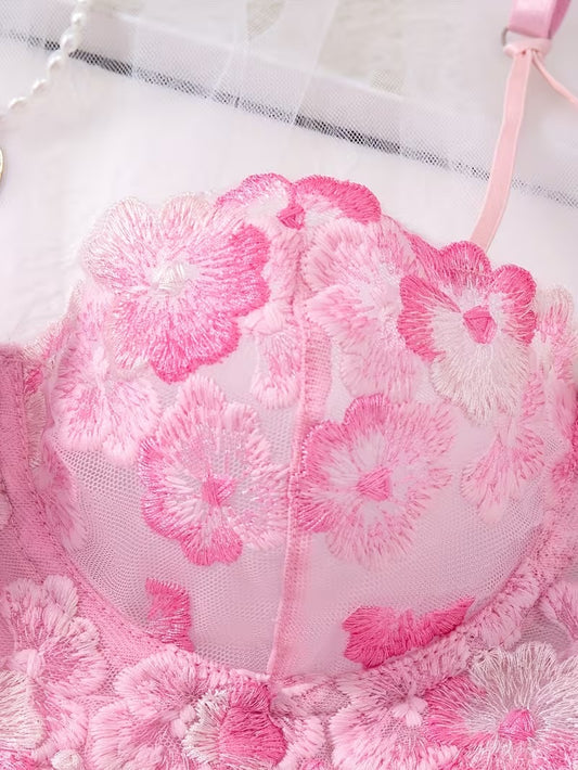 Flourish Sexy Pink Floral Embroidered Lingerie Set – Sheer Mesh Non-Padded Wired Bra & Panty