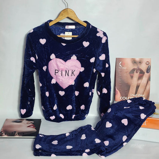 Flourish Velvet Winter Pajama Set – Navy Blue Heart Print “PINK” Edition