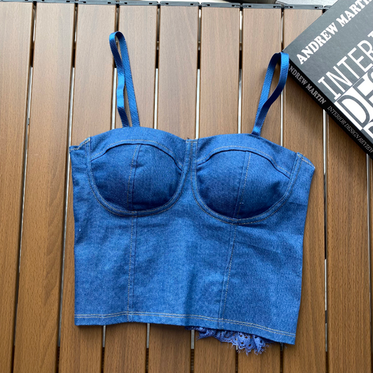 Flourish Ladies Imported Denim Tops Women Denim Vest Camisole Cropped Tank Top Shirt Bra Lace Splice Party Clubwear