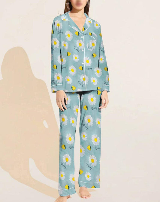Flourish Floral Sun Flower Linen Pajamas Sets With Free Scrunchie Sleepwear Two Pieces Set