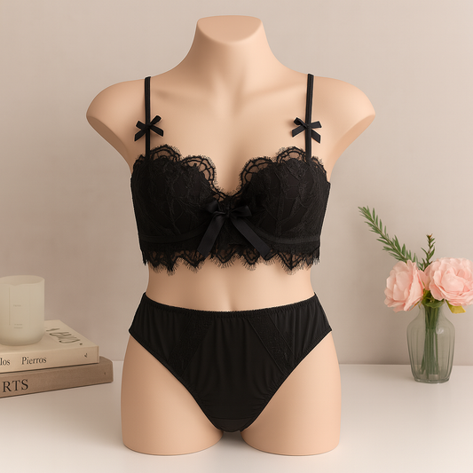 New High-Quality Black Heart Embroidered Push-Up Bra with Cute Lace Panty Set 2007