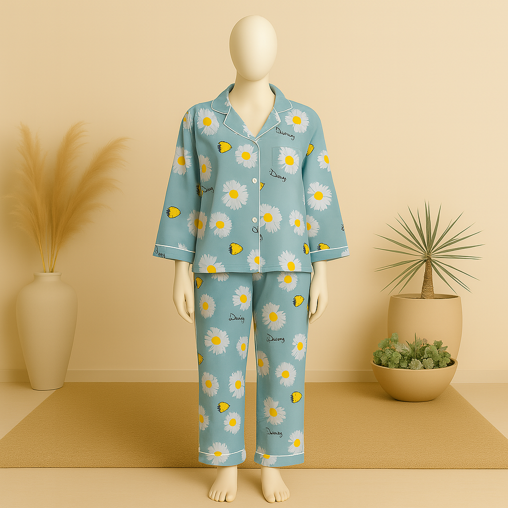 Flourish Floral Sun Flower Linen Pajamas Sets With Free Scrunchie Sleepwear Two Pieces Set