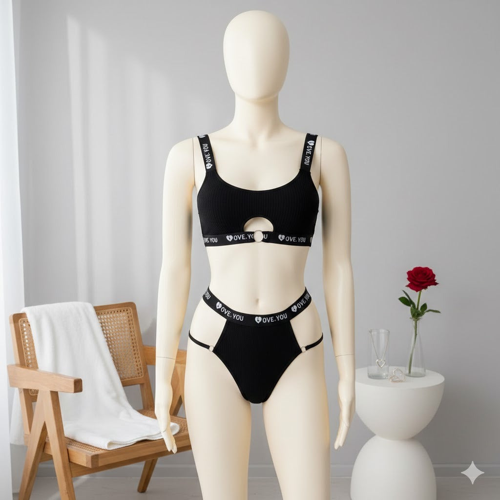 Flourish Love Band Ribbed Non-Padded Bra & Panty Set – Black