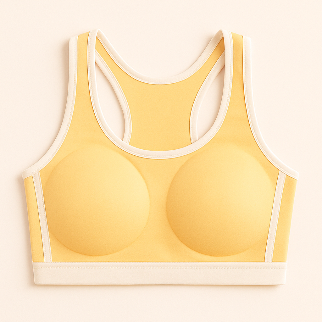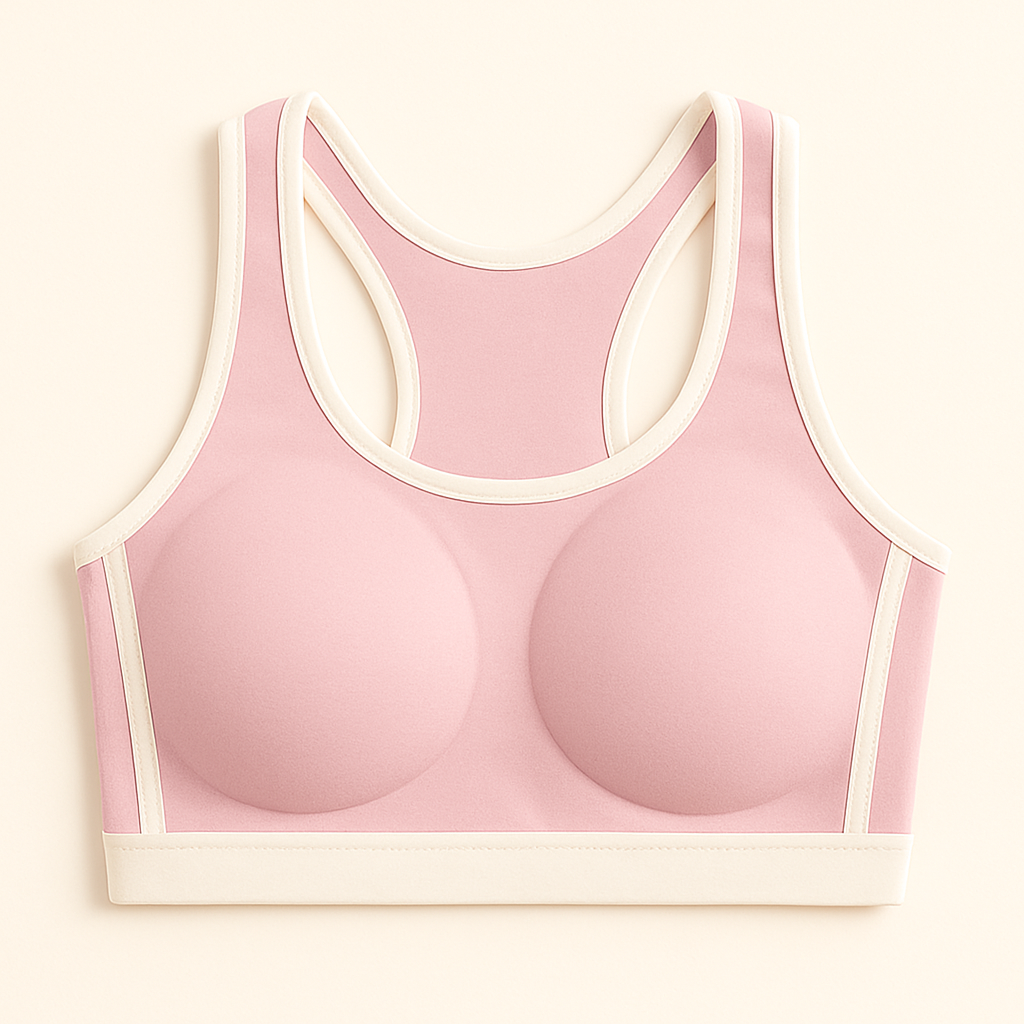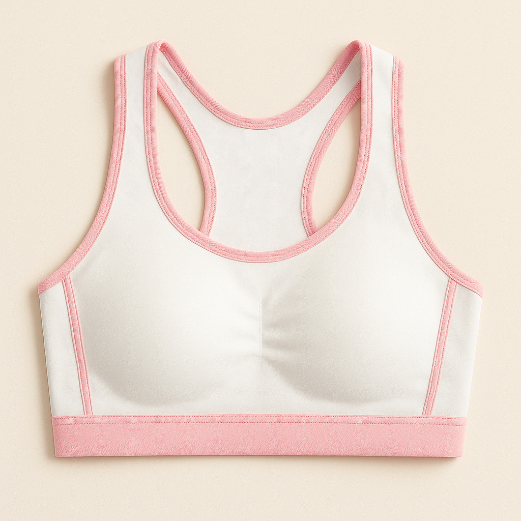 This stylish and functional racerback sports bra features a crisp white base accented with soft pink trim along the straps, neckline, and underband. Designed for comfort and support, it offers a secure fit ideal for everyday wear or light workouts. The smooth fabric and minimalist color contrast create a fresh, youthful look while ensuring ease of movement.